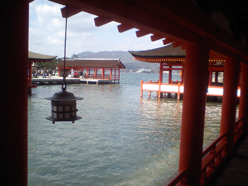 フェリーから降りてお土産屋街をお祭りのような雰囲気を味わいながら進むと、いよいよ厳島神社が見えてまいりました。