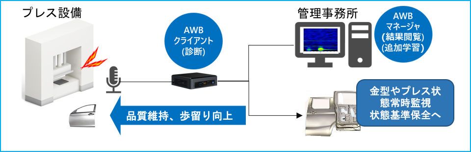 自動車工場などで利用されるプレス設備の稼働の正常性を音響診断で常時監視。
