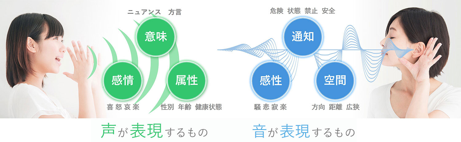 「声」「音」には可視化されていない多くの重要な情報が含まれています。アニモは、人間の感覚に直接訴求する「声」「音」が表現するものは、主に次の6つであると考えます。
