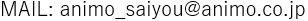 | 連絡先 | 株式会社アニモ 採用担当 〒231-0015 横浜市中区尾上町1-6 ICON関内5F TEL: 045-663-8640 FAX: 045-663-8627 |