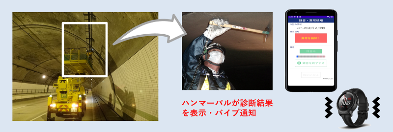 「打音データ」を録音し、その場で、コンクリートの状態をAI判定。スマートウォッチに振動で異常を通知。効率的で安全な作業、点検結果のデジタル化を提供します。