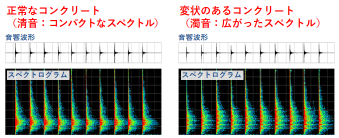 コンクリートの状態は、年代・材料・強度等により千差万別です。相対打音判定方式は、現場のコンクリートを連続槌打することにより、連続打音の中の異常を検出します。外乱音や視覚によるミスリードを排除。車の走行音などに惑わされず判定。浅深部だけでなく高深部の異常も検出可能です。 - 即時判定機能析