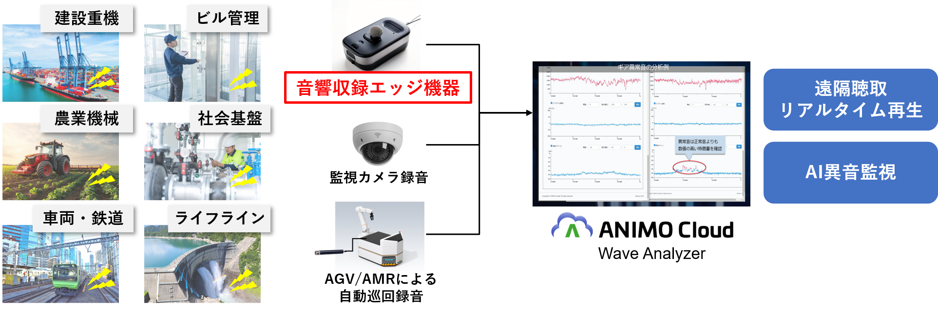 音響振動診断により、いつも違う音が発生すると自動検知する仕組みを提供。点検員(人)が24時間常時監視する必要が無く、通常のモニタリングは音響AIに任せ、重大インシデント発生時にはベテランの耳で判定ができます。 - 専用音響収録用のエッジ機器+Animo Cloud Wave Analyzer(クラウドシステム)