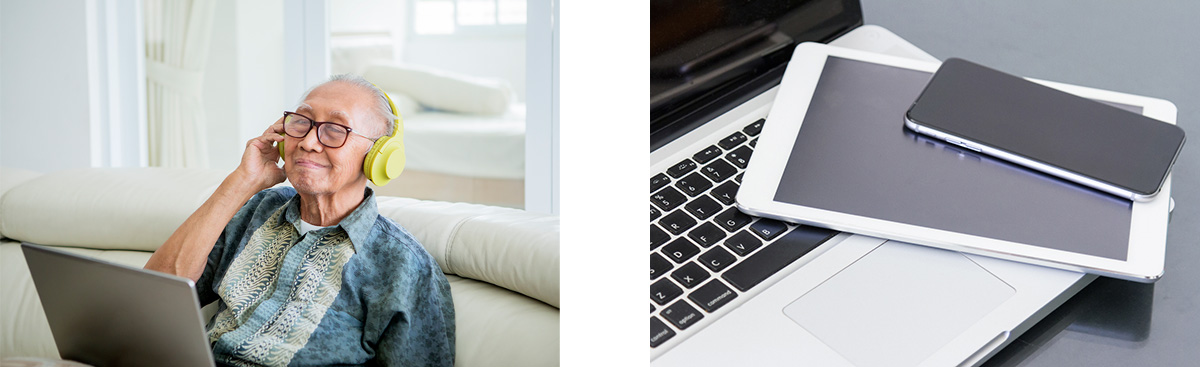 - インターネット接続できるパソコン、タブレット、スマートフォンがあれば、いつでも、どこでも訓練をご利用いただけます。介護施設やリハビリ施設では、大型TVに接続してグループ訓練ができます。