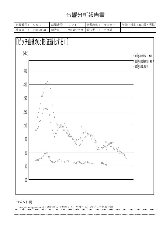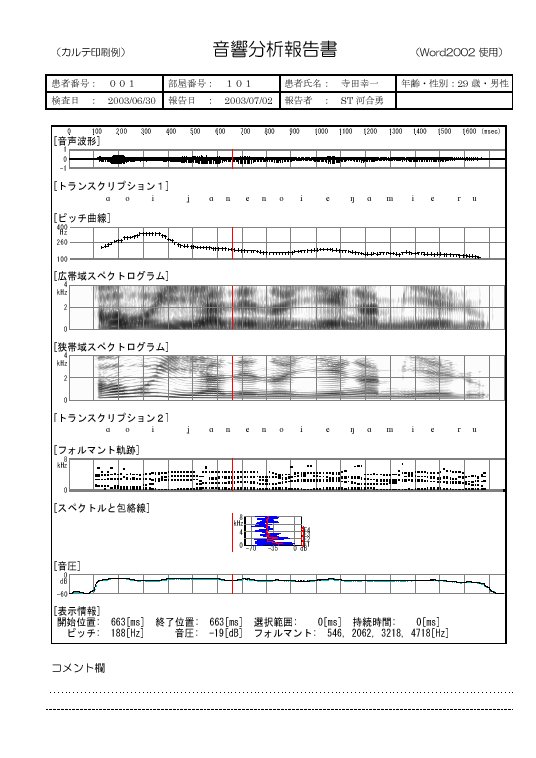 | 分析項目 | ピッチ(F0)抽出[Hz],広域スペクトログラム,狭域スペクトログラム, フォルマント(F1~F4)周波数[Hz], フォルマント軌跡,スペクトル,スペクトル包絡線,音圧[dB], 選択開始/終了位置,選択範囲時間[msec],ピッチ(F0)曲線の比較 |