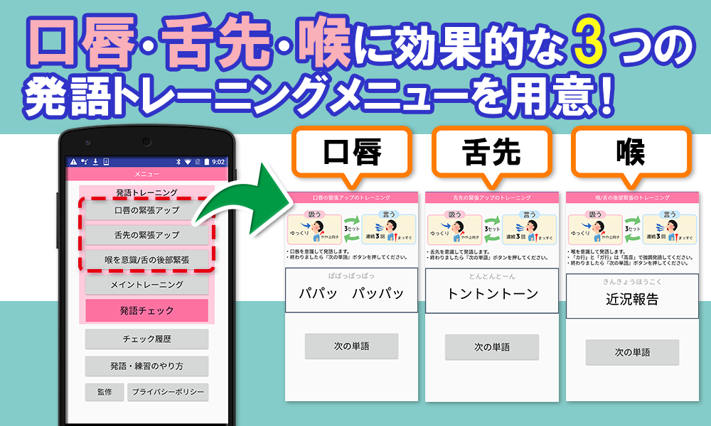 「口唇の緊張アップ」、「舌先の緊張アップ」、「喉を意識/舌の後部緊張」の3つの発語トレーニングで使う筋肉を変える事が出来ます。