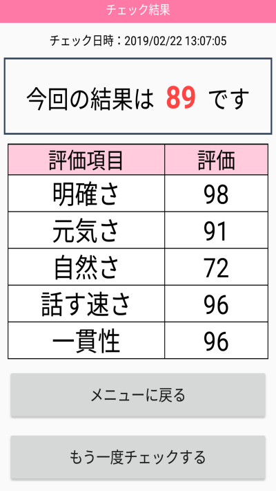 音声分析エンジンによって発語音声を5つの評価観点で数値化(0~100)し、総合結果(0~100)を算出します。